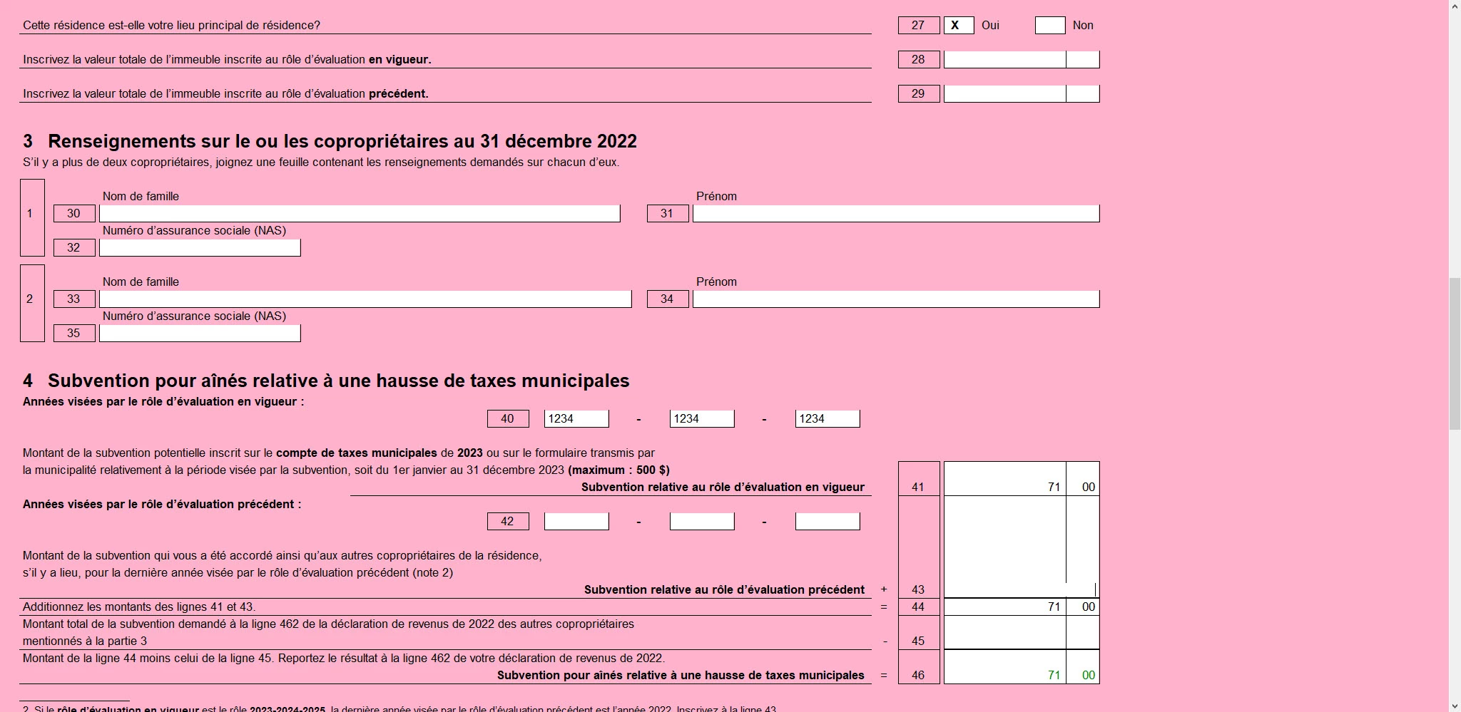 Or, en remplissant avec Turboimpot 2022, la ligne appropriée soit ligne 44, aucun autre propriétaire pour la ligne 45 et le total ne se fait pas en ligne 46 qui doit aller à la ligne 462 de ma déclaration.