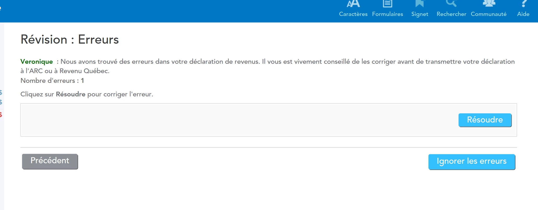 Une erreur est détecté, mais il n'y a pas d'explication ni de résolution possible