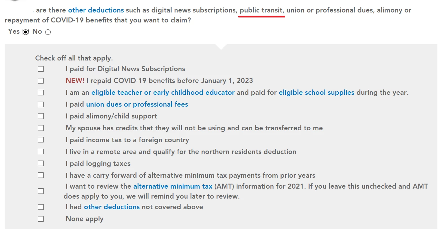 According to everything I've read, in Ontario (where I am filing my taxes), for the 2021 tax year, I can't claim public transit as an expense in my taxes (note that I am not a senior either). However, in this screen in TurboTax, it clearly lists "public transit" (underlined in the pic for emphasis) as an example. Was that an error? Or does that refer just to seniors who apply for the credit?