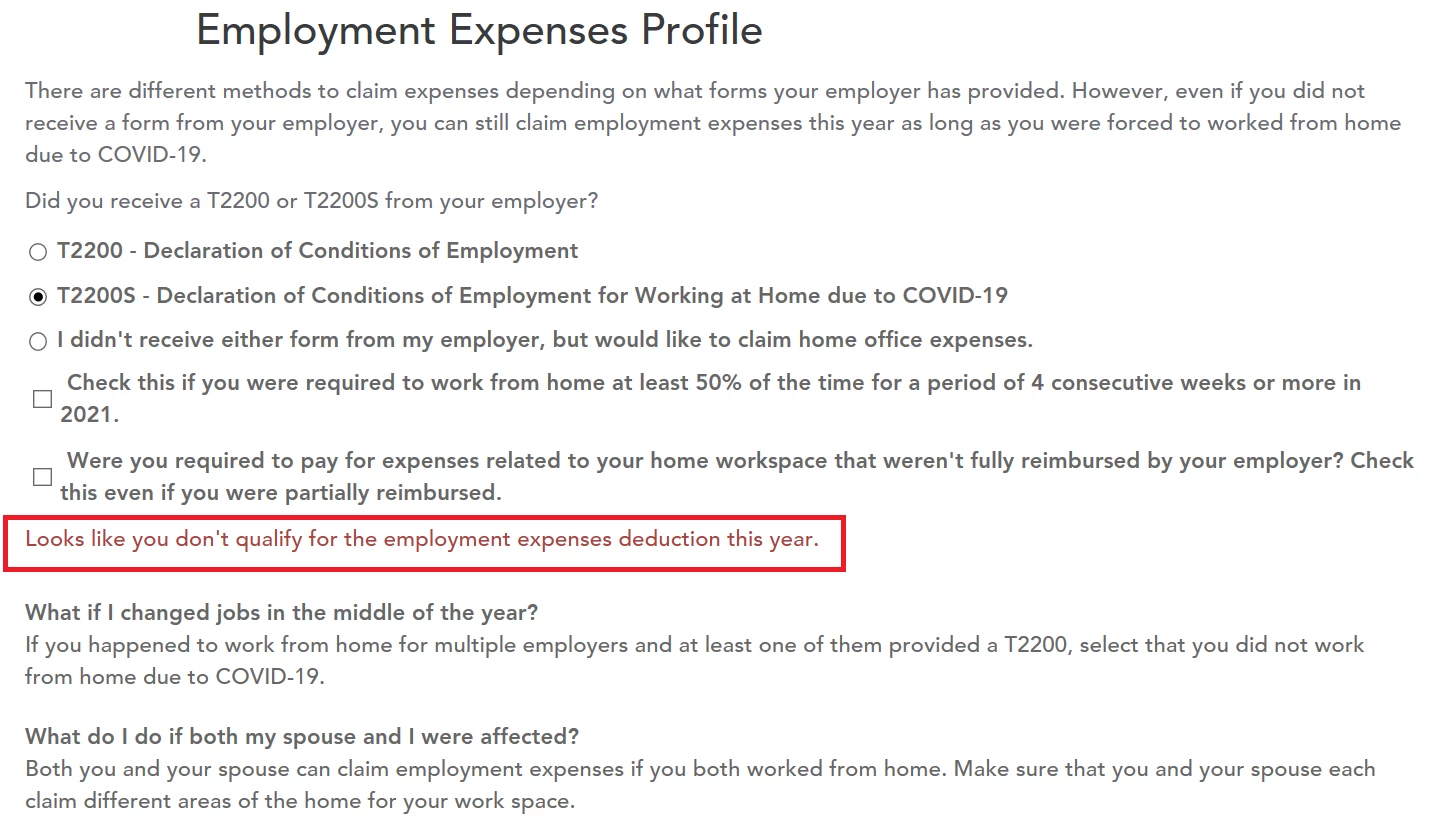 I worked from home for the entirety of 2021 and am filing my taxes in Ontario. I received a signed T2200S from my employer. As per the attached pic though, anyone know why it says I don't qualify for the employment expenses deduction? I can't seem to find any reasons why I am not eligible on CRA's website, given my company has an office but I did indeed work from home...
