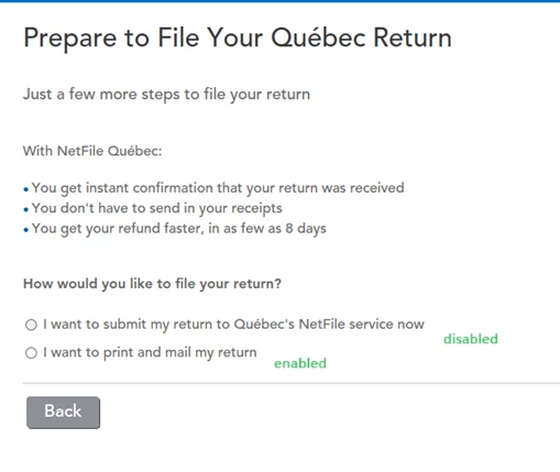 Quebec -> I want to submit QuebecNetFile is grey out, but to print and mail cannot select it.