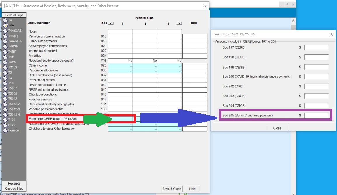 If you are using TurboTax CD/Download in forms mode, click on “Forms” in the blue income bar, then select T4A from the list and click Ok. On the T4A entry page, click the blue box next to “Enter here CERB boxes 197 to 205”. On the pop-up that appears, Box 205 will be on the bottom.