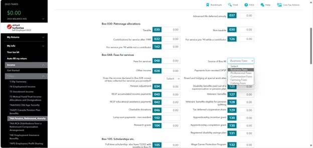 For the amount to be reflected in line 13500, which is self-employed business income, you need to specify the source of Box 48 as "Business Fees" from the drop-down list, as shown in the picture.