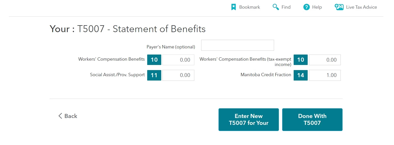 Select "Enter New T5007". Report the amount in Box 10 as mentioned. Then, click "Done with T5007".