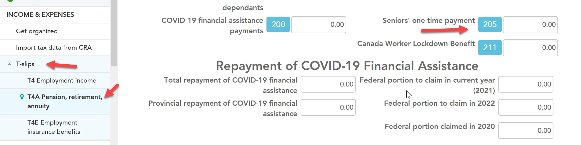 At the T4A screen, scroll down to the section COVID Related Benefits, you can see box 205 (One-time payment for older seniors).Here iswhere you can report your one-time payment in Box 205.