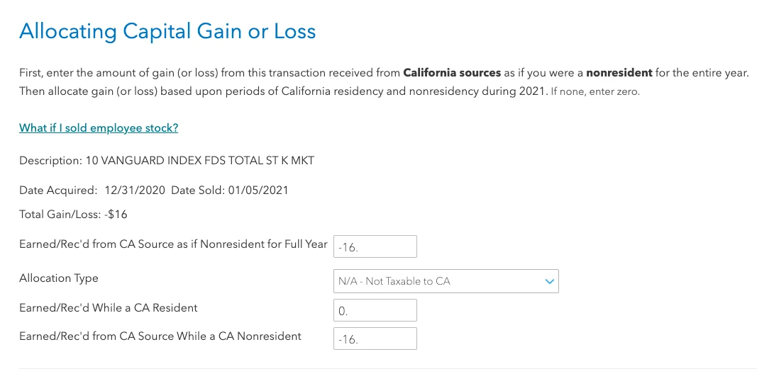 However, stocks aren't tied to an area. How should I answer these questions? For example: for "Earned/Rec'd from CA Source as if Nonresident for Full Year", shouldn't I put $0 because, if I were a non-resident, then the sell would be a non-CA source?