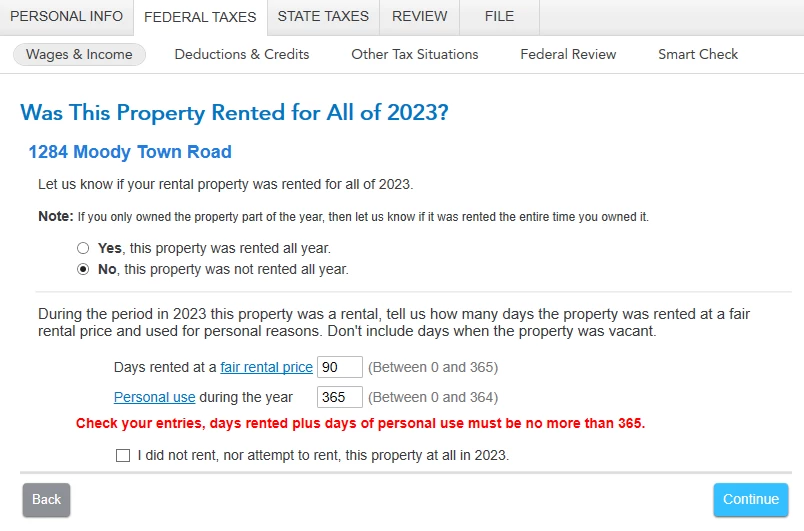 When I continue onto the next page titled “Was This Property Rented for All of 2023?”, I obviously select “No, this property was not rented all year.” But, I am then confronted with a dialog to enter the number of days rented at a fair rental price (0 to 365) and the number of days for Personal use during the year (0 to 364).