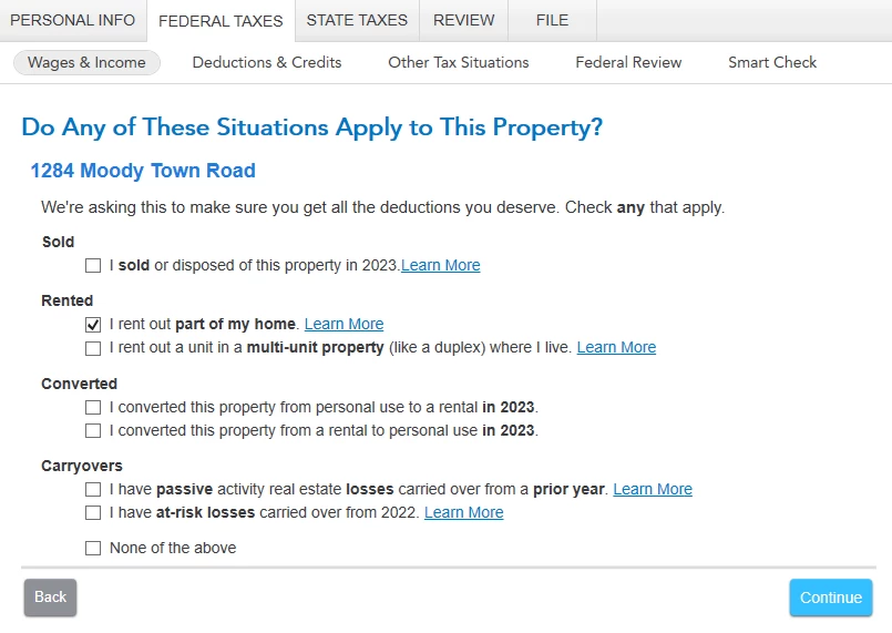 I rent rooms in my home during the fall and the spring to contractors that come into town to perform maintenance at a local utility. In TT 2023 on the page "Do Any of These Situations Apply to This Property?" I select the option “I rent out part of my home.”