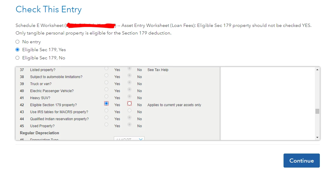 | Schedule E Worksheet -- Asset Entry Worksheet (Mortgage Loan Points): Eligible Sec 179 property should not be checked YES. Only tangible personal property is eligible for the Section 179 deduction. (But I am not setting this as Yes, TT fills the form Schedule E, not me.) |