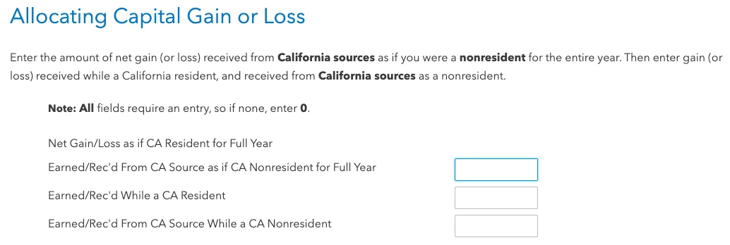 I moved from California to another state. I had capital gains/losses, almost all in the stock market. How do I interpret the Allocating Capital Gain or Loss screen?