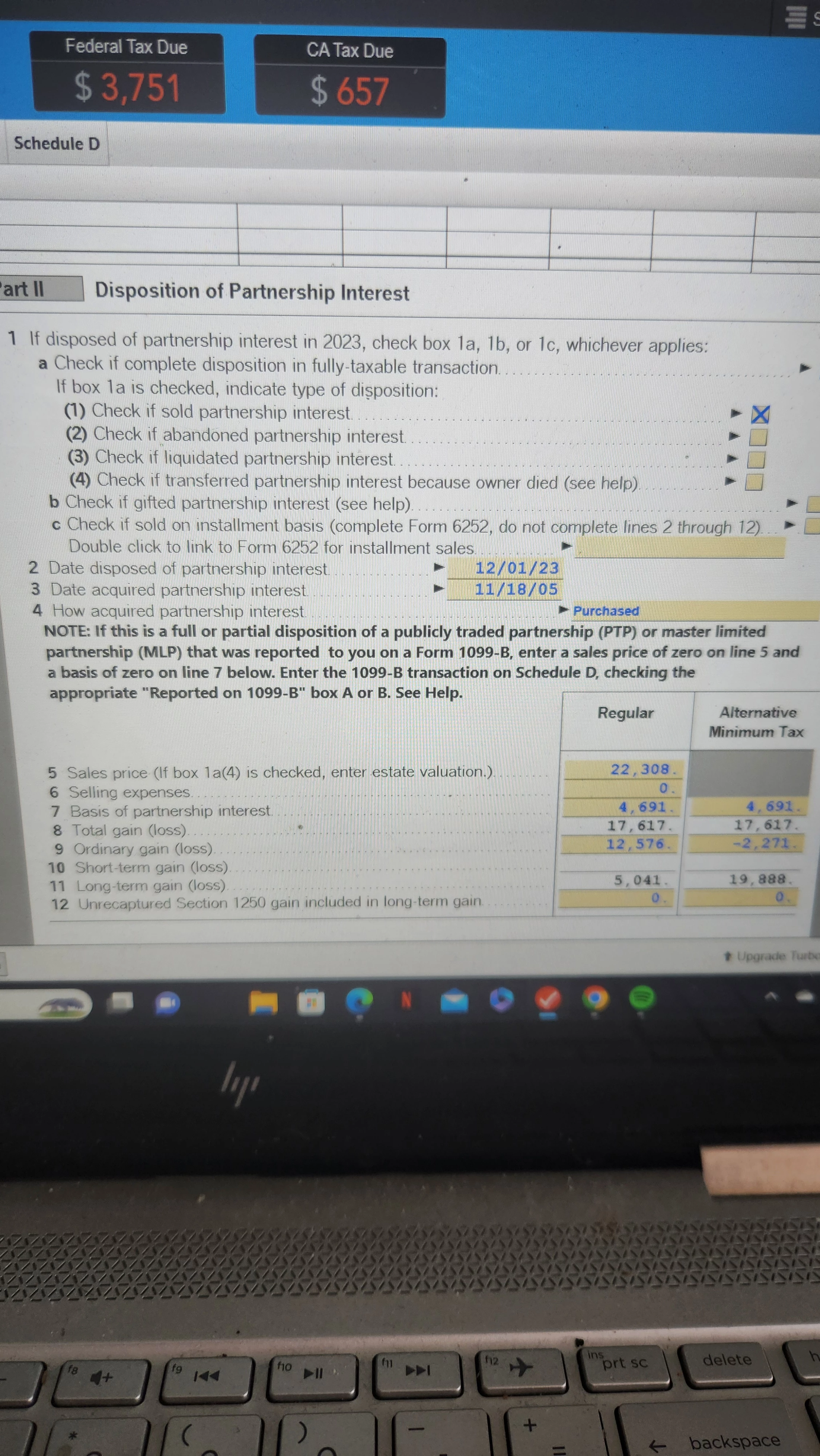 First: i put that the partnership ended in 2023 and that it was as a complete disposition of the K1. instead of disposition was not via sale, sold and am receiving payments and no entry. Please let me know if that is correct?