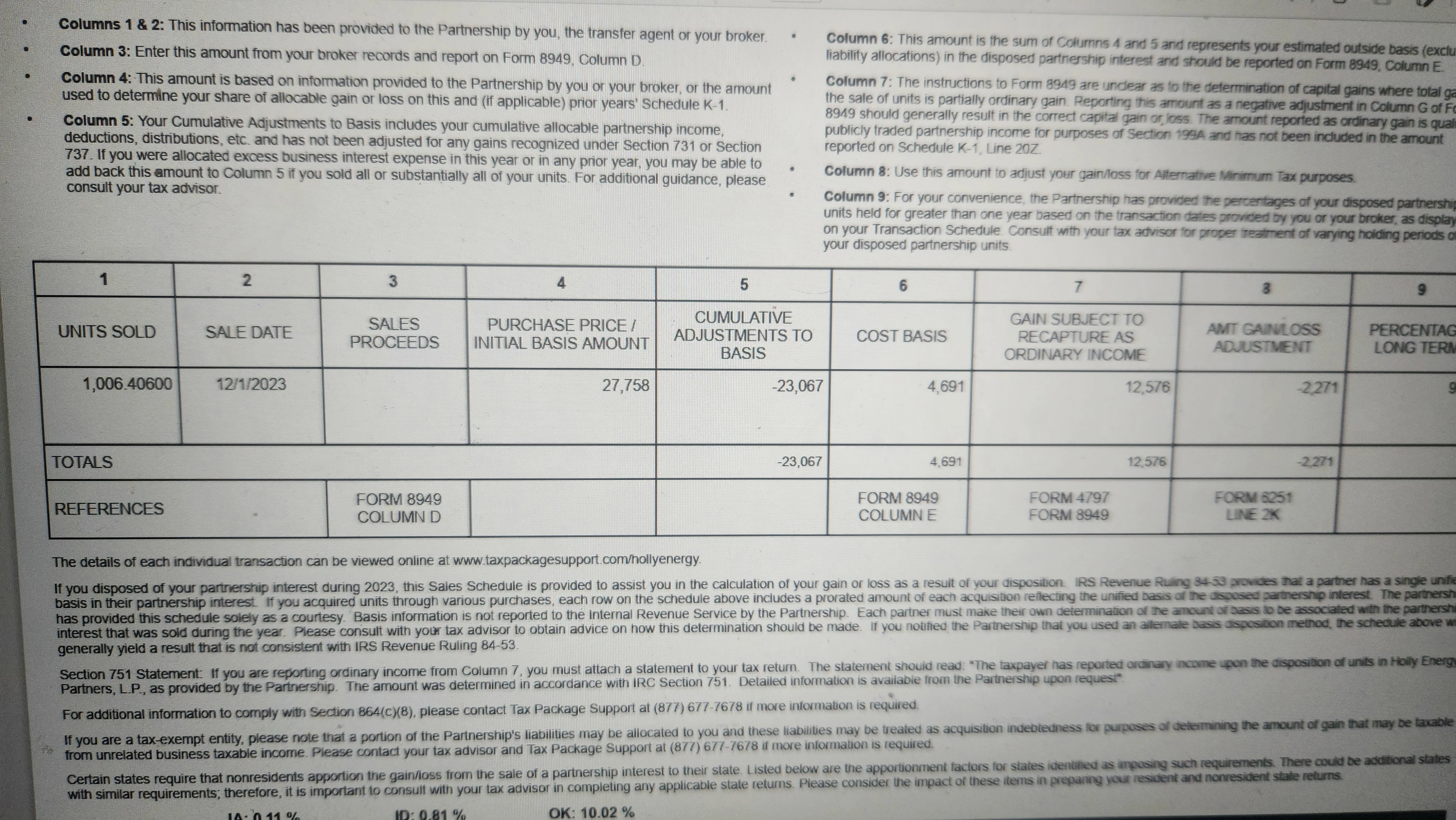 “Column 7:The instructions to Form 8949 are unclear as to the determination of capital gains where total gain on the sale of units is partially ordinary gain. Reporting this amount as a negative adjustment in Column G of Form 8949 should generally result in the correct capital gain or loss. The amount reported as ordinary gain is qualified publicly traded partnership income for purposes of Section 199A and has not been included in the amount reported on Schedule K-1, Line 20Z”