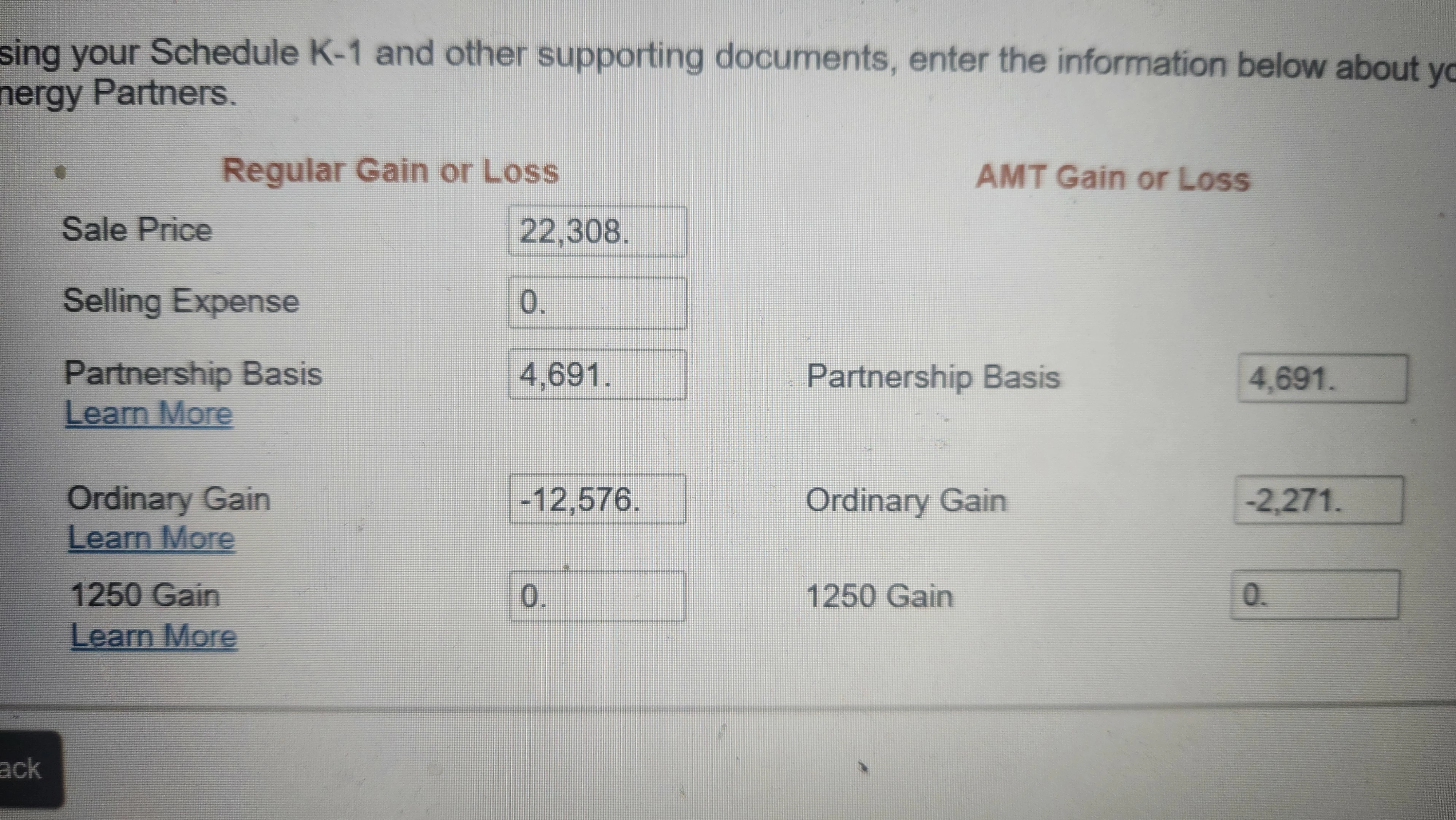 Using K1 sales (see attached) schedule shows this number as 12576 (in gain subject to recapture as ordinary income). Next column shows amt gain/loss adjustment as -2271. I entered them as seen in picture. The most important part and confusion part is the instructions listed to column 7; see below. See bold line