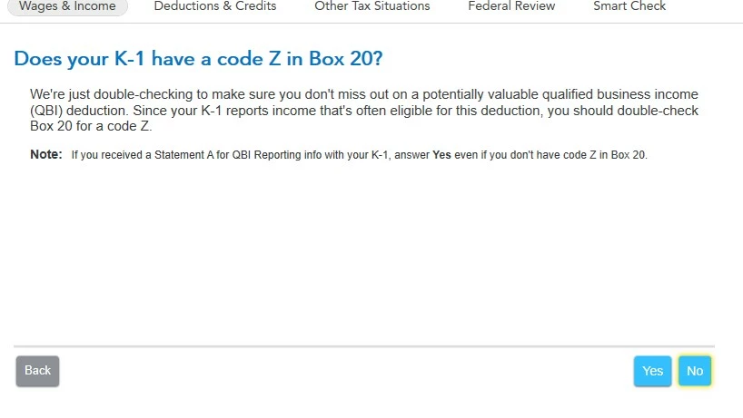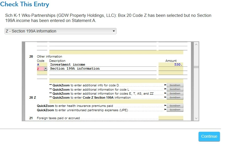 If I leave Code Z off of my Box 20 entry, I'm later asked if I missed Code Z, and to answer yes even if my K-1 doesn't have Code Z in Box 20: