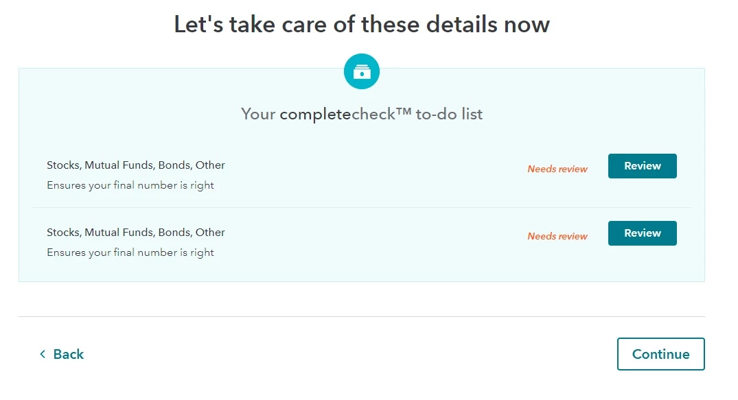 I am stuck on the review. TurboTax is flagging something wrong and giving me 2 "to-do" items for my stocks. No matter how much I review it, it will not allow me to proceed. I entered the sales section, total proceeds, total cost basis, checked the box for total adjustments to gain or loss, chose W, hit continue, upload my 1099-b pdf file, then hit done and it still says it's not complete. What is going on? Driving me insane.