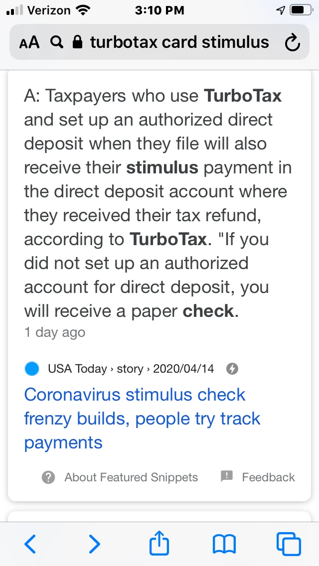 FYI- the status of my payment originally was that they didn’t have enough information to send my payment based on my most recent tax return. So basically I got the Turbo Tax Debit Card-no advance, and not a Rush card just the normal Green Dot Turbo Tax card-and basically somehow Turbo Tax has my information all screwed up because the IRS didn’t have enough info to send me my stimulus payment. Everyone around me is getting theirs and I’m sitting here like a fool come to find out it’s because of Turbo Tax. I paid $230 to get my taxes done by them and they screwed me on both my tax refunds and the stimulus. I won’t be back to do business with them again.