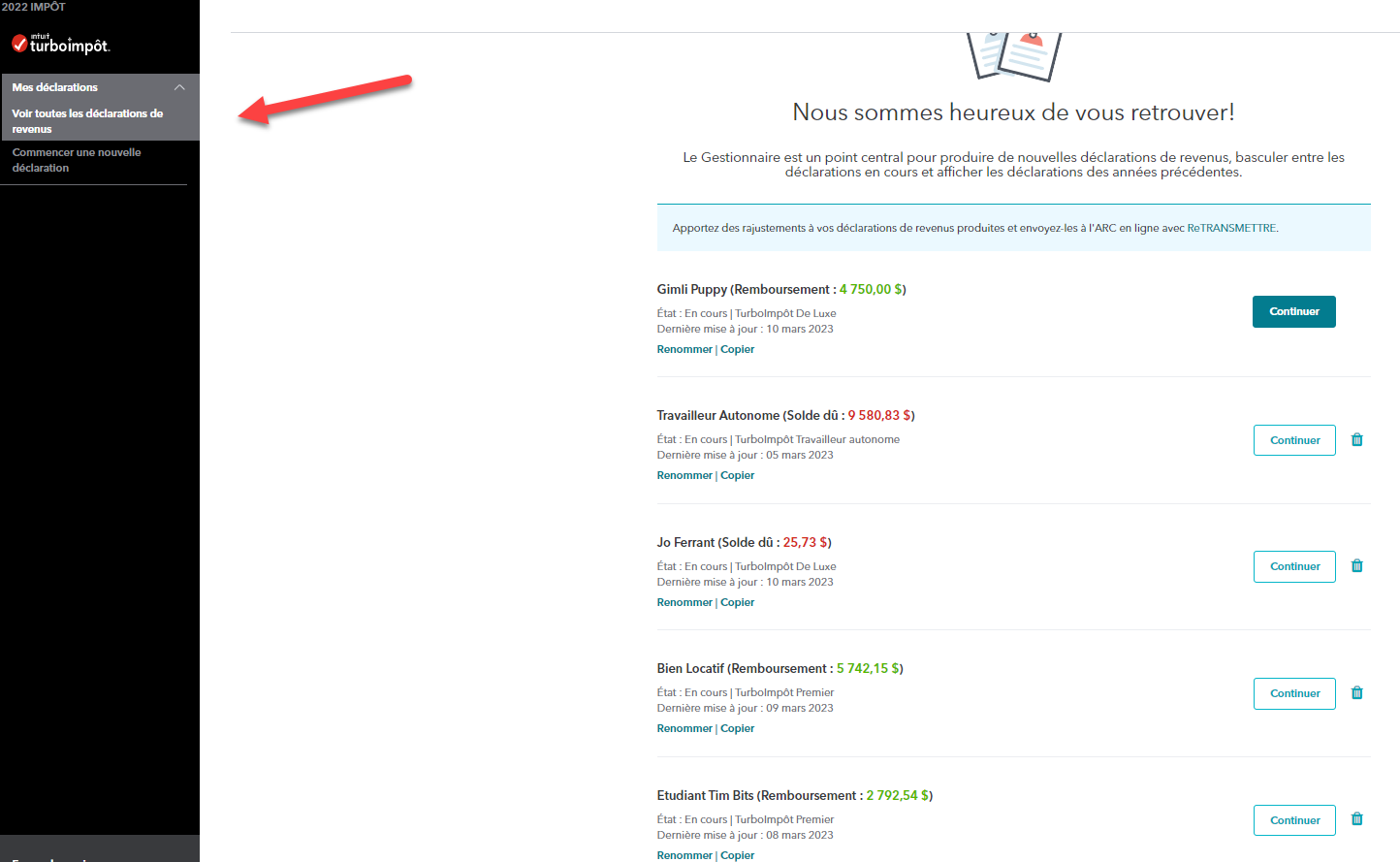 Chaque logiciel en ligne (Gratuit - De Luxe - Premier) produise une déclaration seulement. Vous pouvez faire plusieurs déclarations lorsque votre compte TurboImpôt est ouvert et que vous en avez commencer une. Vous devrez payer pour chaque déclaration indépendamment.
