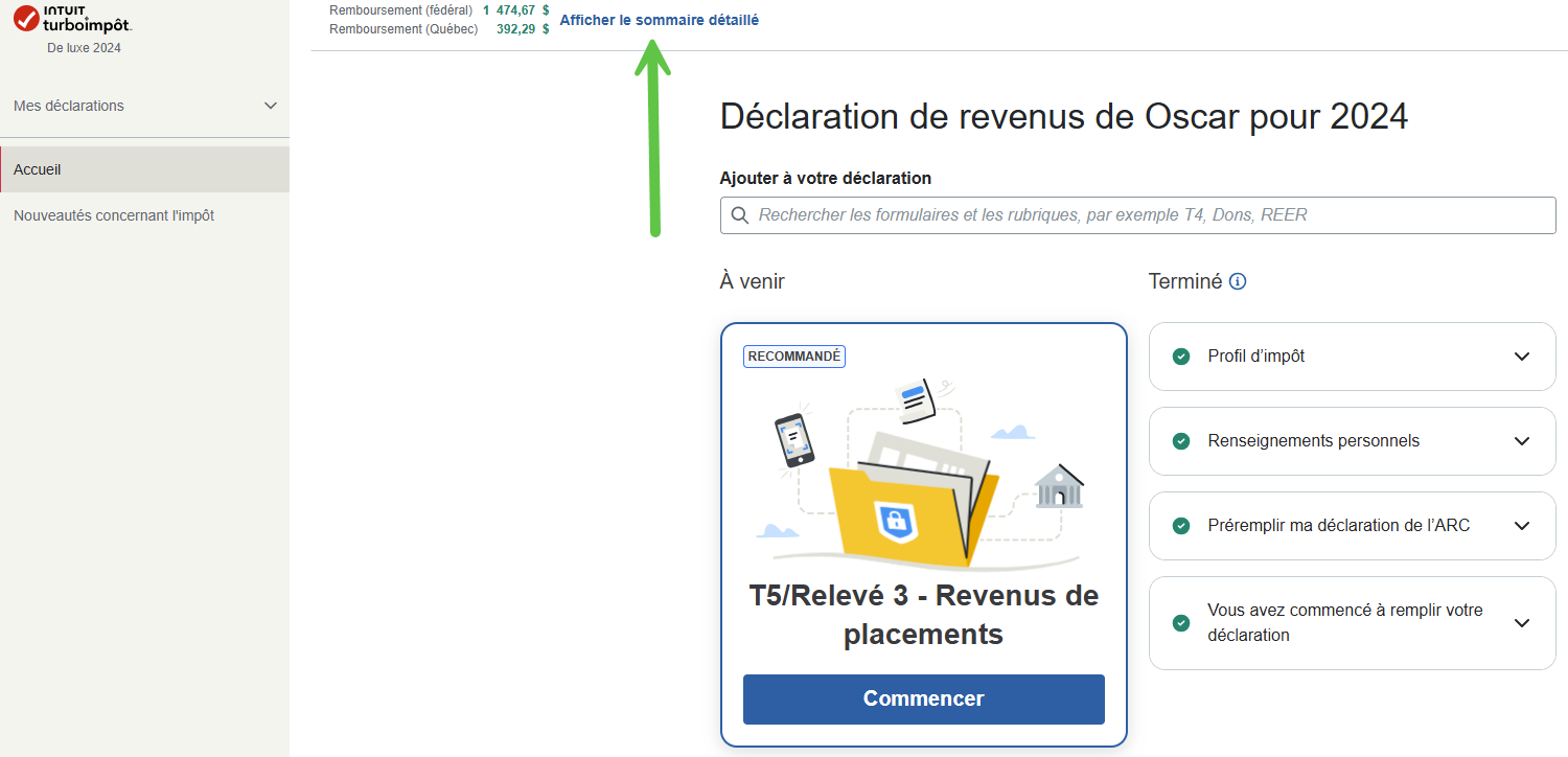 Dans TurboImpôt en ligne pour voir le sommaire détaillé fédéral et ensuite le provincial, cliquez sur Afficher le sommaire détaillé au haut de la page.