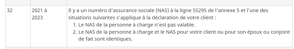 Selon l'Agence du revenu du Canada, le code 32 signifie une erreur dans un numéro d'assurance sociale. Veuillez reviser votre déclaration du début et vous assurer que vous n'avez pas entrer de tiret ni d'espace dans le ou les numéros d'assurance sociale, et que ce sont les bons chiffres.