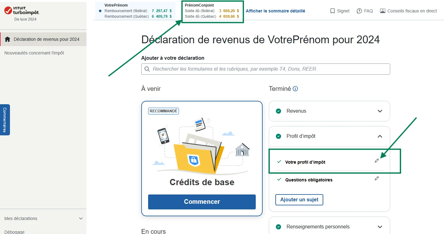 Dans la version en ligne, vous pouvez basculer vers la déclaration de votre conjoint à partir de la bande au haut de l'écran et ensuite choisir la section "Votre profil d'impôt",