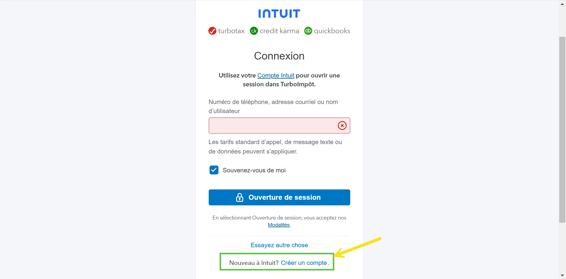 • Cliquez dans le bas du carré qui Nouveau à Intuit? Créer un compte.