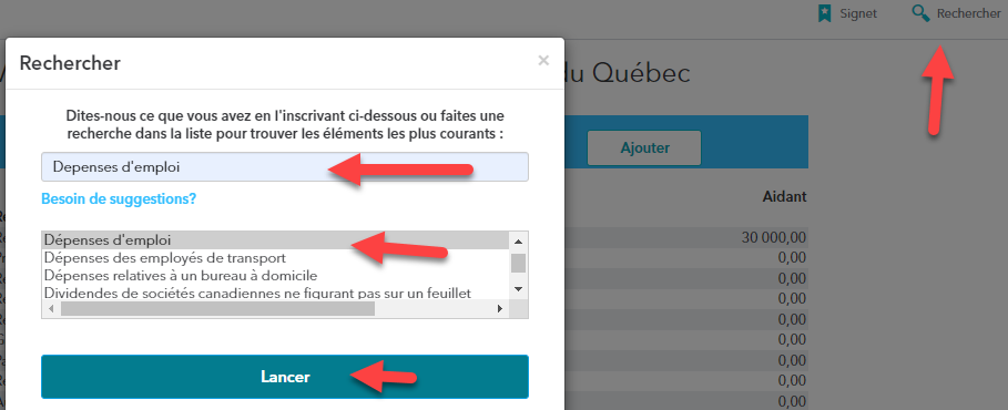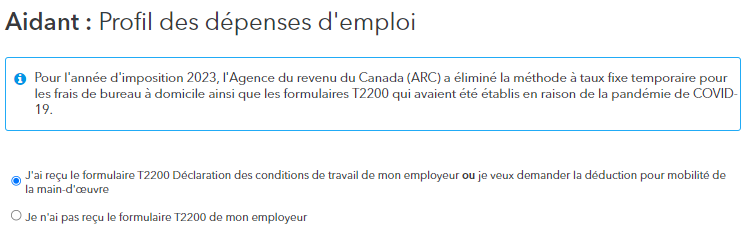 Dans la section d'entrevue au début de la déclaration, cochez que vous avez des dépenses d'emploi. Continuer à remplir les prochaines pages. Vous arriverez à la page Dépenes d'emploi. Vous pouvez faire une recherche directe pour y arriver.