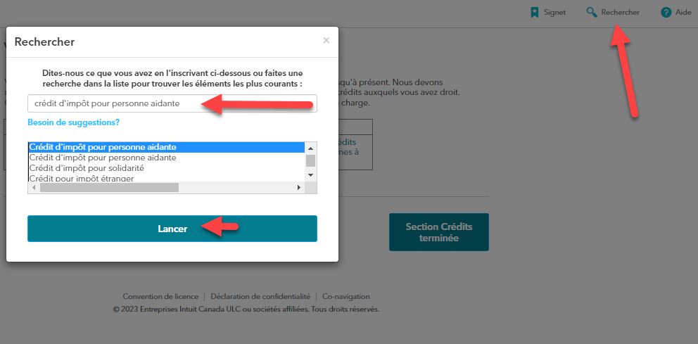 Cliquez sur Rechercher (la loupe) dans le menu en haut à droite. Tapez crédit pour personne aidante dans la barre de recherche. Cliquez sur crédit pour personne aidante et cliquez LANCER.