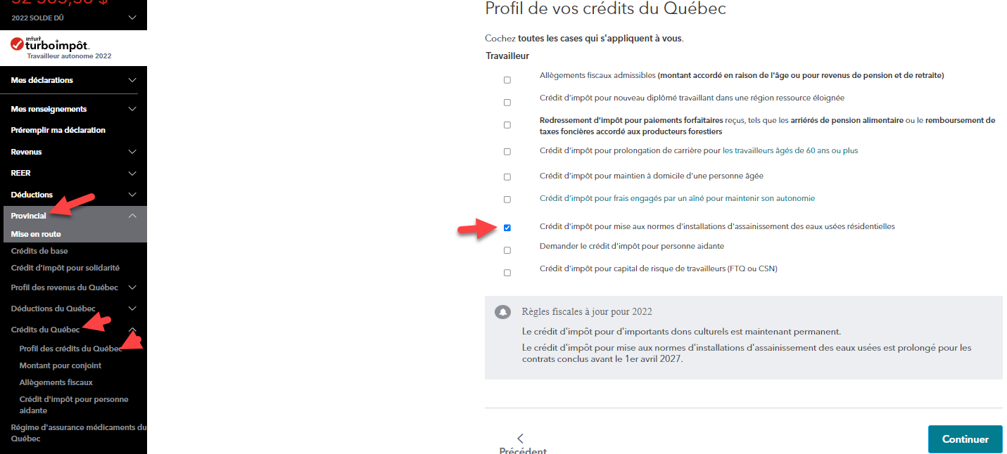 Dans TurboImpôt en ligne cliquez Provincial - Crédits du Québec - profil des crédits du Québec. Cochez la case et sur les prochaines pages, vous entrez vos données.