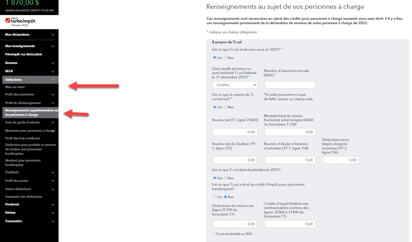 Par la suite, pour entrer ces informations cliquez Déductions - Renseignements supplémentaires sur les personnes à charge.