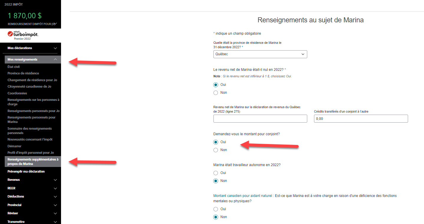 Vous ne pouvez pas déclarer votre conjoint comme personne à votre charge. Vous pouvez demander le montant pour conjoint dans le menu de gauche sous Mes Renseignements -Renseignements supplémentaires au sujet de (nom). Répondez aux autres questions selon votre situation. Vous recevrez les crédits appropriés.