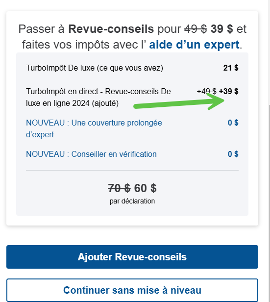 Cliquez sur Ajouter Revue-Conseils pour 39$ de plus. Si vous ne voulez pas le service, cliquez Continuer sans mise à niveau. Une fois Revue-conseils ajouté, vous ne pourrez pas le canceller.