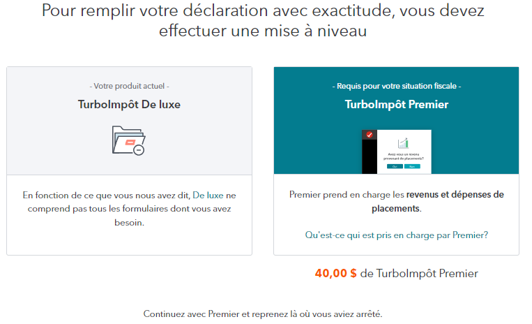 L'offre de mettre à niveau est offerte à plusieurs endroits dans la déclaration selon les entrées de données que vous faites. Si vous n'avez pas besoin de la version Premier, le logiciel ne l'offre pas.