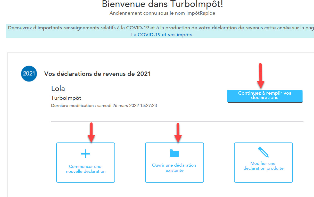 Chaque membre de la famille produit sa propre déclaration et c'est possible de le faire sous un seul nom d'utilisateur. Si vous avez acheté le logiciel Cd/téléchargement De Luxe pour 8 déclarations ou Premier pour 12 déclarations, vous n'avez qu'à commencer une nouvelle déclaration en cliquant sur Commencer une nouvelle déclaration. Si vous utilisez TurboImpôt en ligne, vous ne pouvez faire qu'une seule déclaration par logiciel.