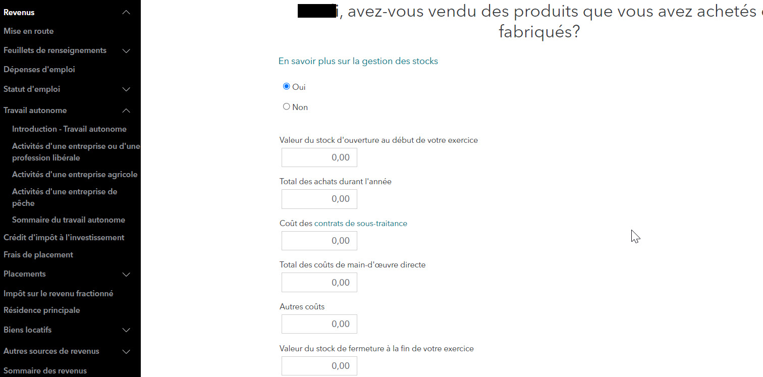 Lorsque vous entrez les informations pour votre entreprise, vous répondez OUI à la question 'avez-vous vendu des produits que vous avez achetés ou fabriqués?' des questions spécifiques s'ouvrent et vous pourrez entrer les achats effectués durant l'année. Ces questions sont reportés dans la partie 3D du T2125. Voici des liens pour votre infomration sur le travail autonome: Conseils fiscaux pour PME : remplir un formulaire T2125 et de l'Agence du revenu du Canada: Comment remplir le formulaire T2125