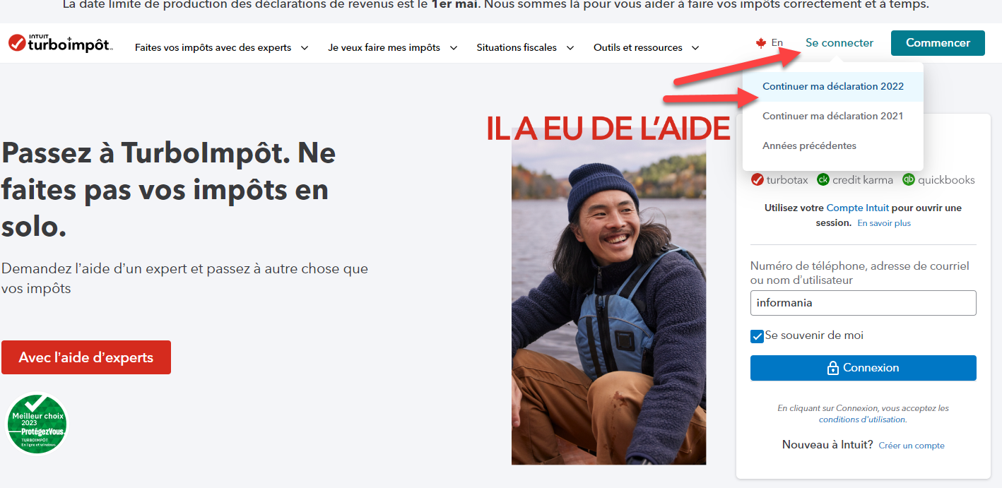 Vous devez vous connecter sur TurboImpot.ca Cliquez sur Se connecter et ensuite cliquez sur Continuer ma déclaration 2022. Vous aurez besoin de votre nom d'utilisateur et mot de passe.