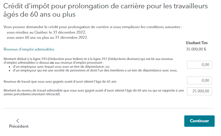 Si vous avez eu 65 ans au cours de l'année 2022, dans la case: Revenus de travail que vous avez gagnés avant d'avoir atteint l'âge de 65 ans entrez le montant de salaire de l'année 2022 avant votre fëte. Ce montatn doit être plus que $ 5000.00