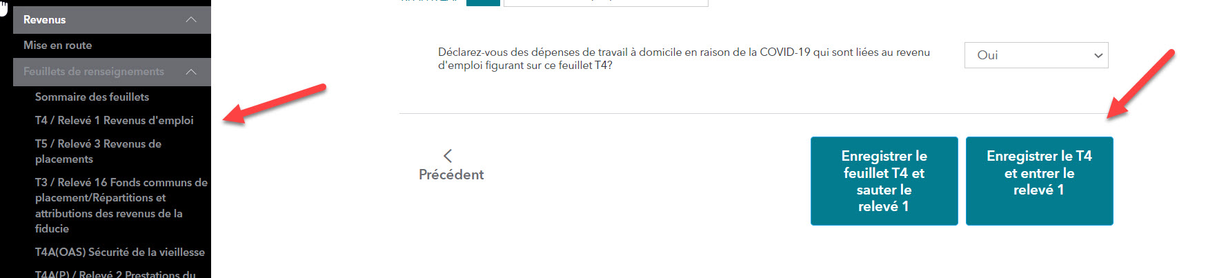 Après que vous ayez entré votre T4, il y a une case bleue au bas de la page qui indique Enregistrer le T4 et entrer le relevé 1. Vous pouvez aussi cliquer sur Revenus - Feuillets de renseignements - T4 / Relevé 1 dans le menu de gauche.