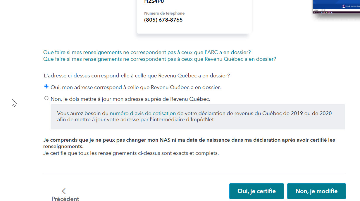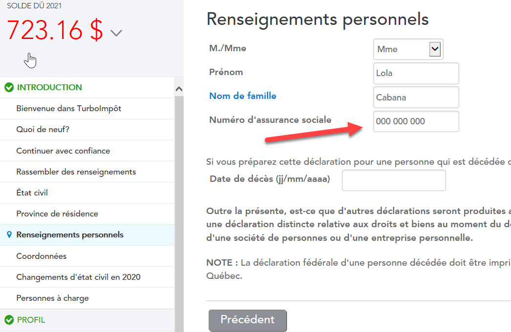 Vous pouvez changer votre numéro d'assurance sociale dans TurboÎmpôt en ligne avant d'arriver à la section qui vous demande OUI, JE CERTIFIE.