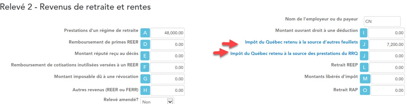 Je transfert mon revenu de pension à ma conjointe, pour le Québec le montant proportionnel d'impôt ne se transfert pas à ma conjointe. J'ai un relevé 2, l'annexe Q partage le montant de pension mais pas la portion d'impôt.