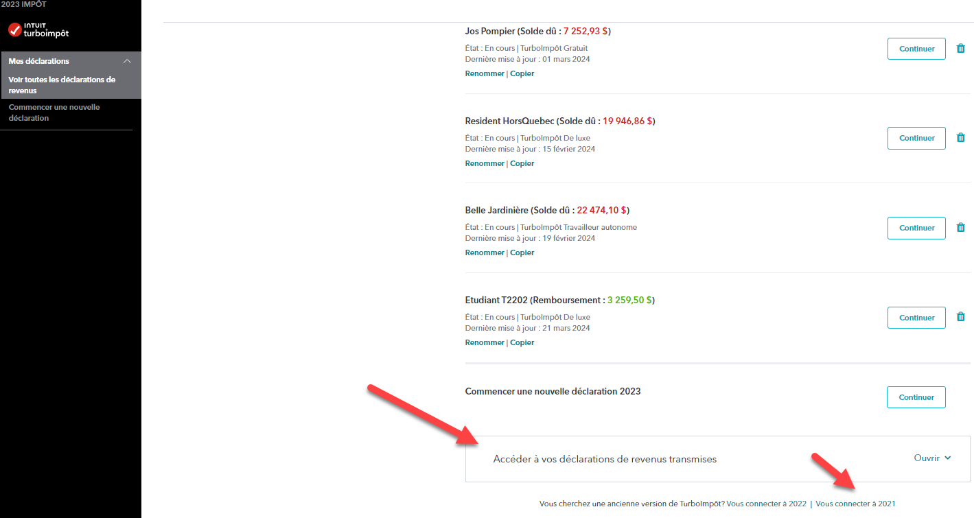 Si c'est possible de les récupérer, vous pouvez essayer de cliquer au bas de la page. Si vos déclaration ne sont pas là, vous ne pourrez pas les récupérer. Un format condensé de vos déclaration soumises aux gouvernements se trouvent dans vos dossiers électroniques.