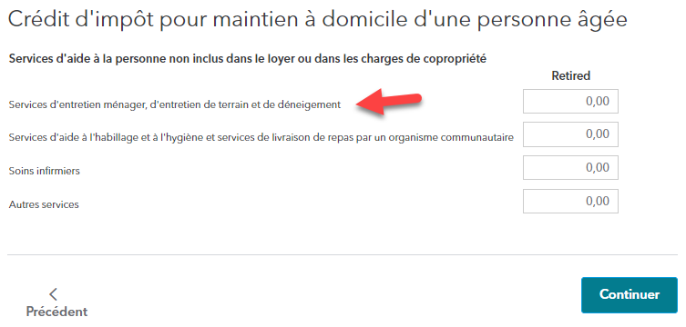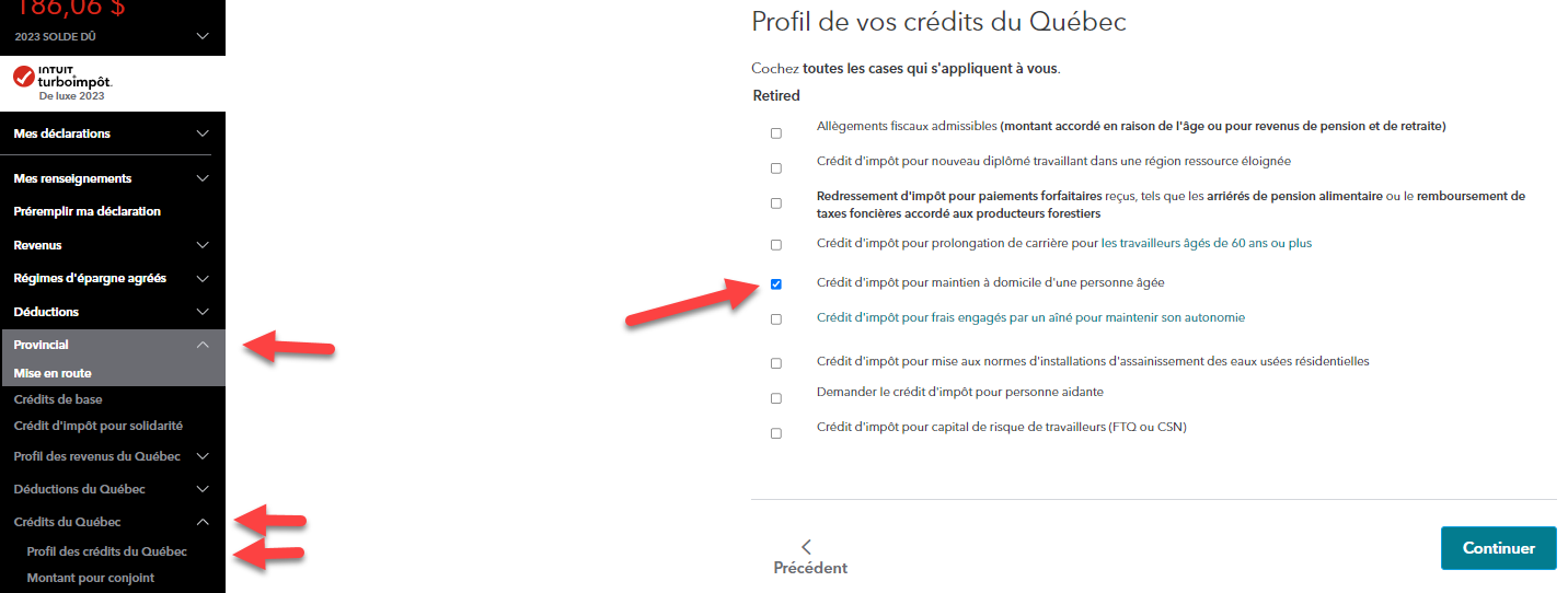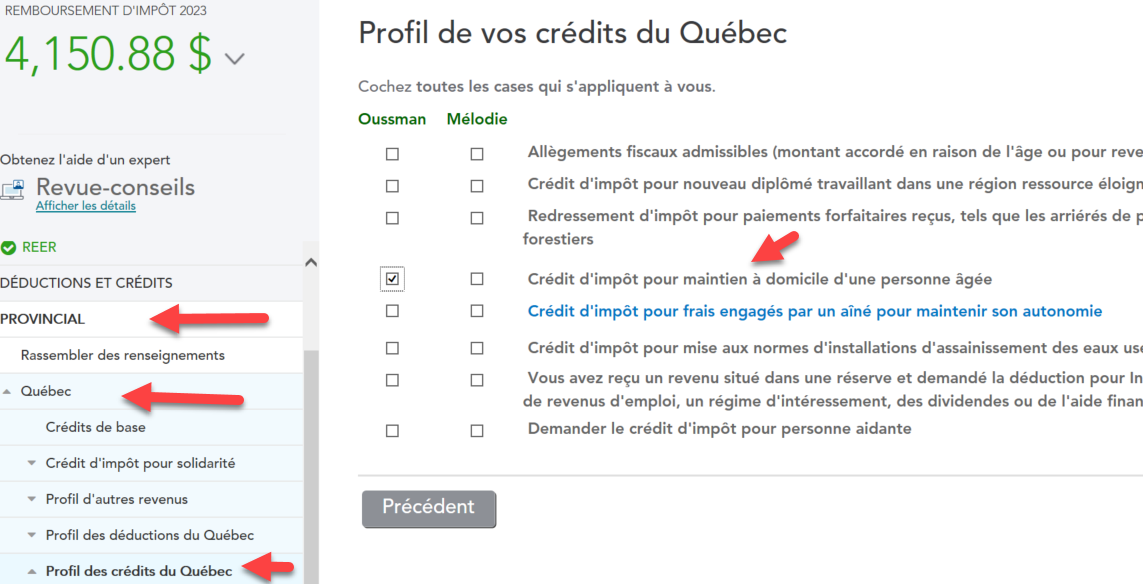 Vous pouvez demander cette dépense dans le crédit pour maintien à domicile d'une personne âgée. Dans votre logiciel dans le menu de gauche, cliquez sur Provincial - Crédits du Québec - Profil de vos crédits du Québec. Cochez la case du crédit.