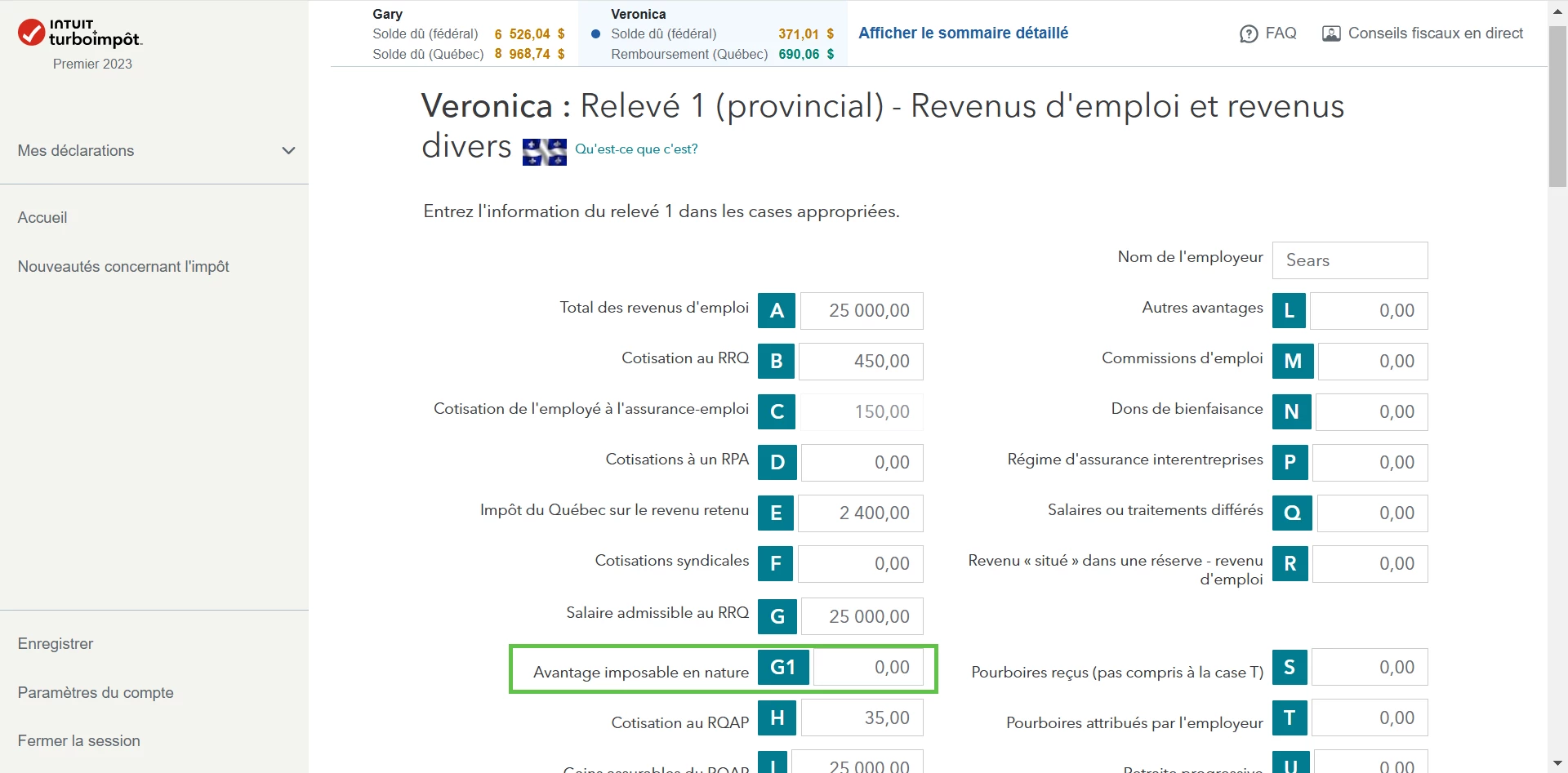 Cette case G-1 indique que vous avez reçu un avantage sur lequel aucune cotisation au RRQ n'a été retenue. La case G1 est un avantage imposable en nature. C'est-à-dire que l'employeur offre un service ou un bien (stationnement, voiture, repas, etc) pour l'exercice de vos fonctions.