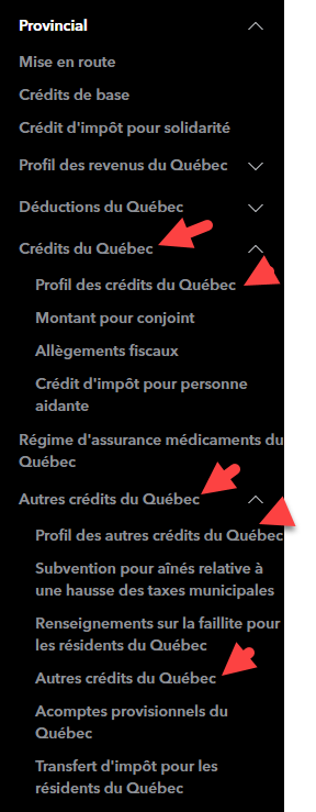 Remplissez vos renseignements personnels et par la suite, lorsque vous continuez votre déclaration vous arrivez à Provincial. Assurez-vous de cliquer sur Profil des crédits du Québec et cocher ce qui vous concerne. Cliquez sur Autres crédits du Québec et Profil des autres crédits du Québec pour cocher ce qui vous concerne. Plus bas encore dans le menu cochez Autres crédits du Québec et cochez ce qui vous concerne. En faisant ces étapes une à une vous trouverez le crédit que vous cherchez.