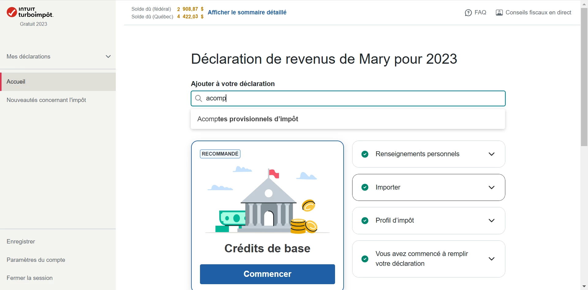 Dans TurboImpôt en ligne, à la page d'accueil, cliquez sur la barre de recherche : tapez acomptes provisionnels et cliquez dessus.