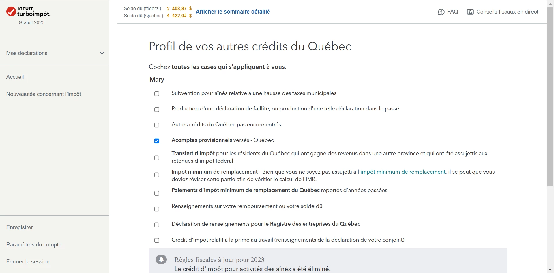 Pour entrer des acomptes provisionnels pour la déclaration Provincial. À la page d'accueil, cliquez sur "Provincial" >> Profil de vos autres crédits du Québec et vous obtiendrez cette page: