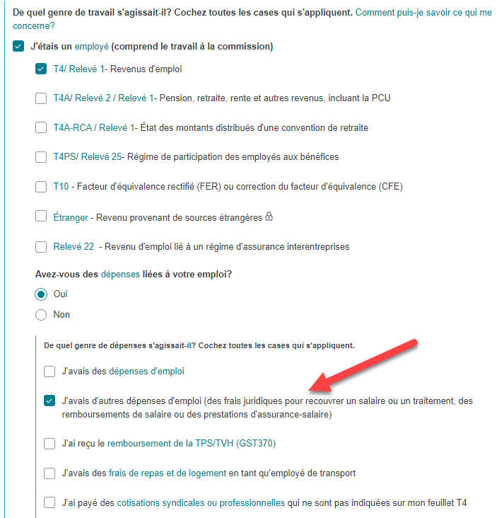 Dans le menu de gauche cliquez Mes Renseignements - Démarrer et à la question 'avez-vous des dépenses liés à votre emploi?' cochez OUI et cochez la deuxième case.