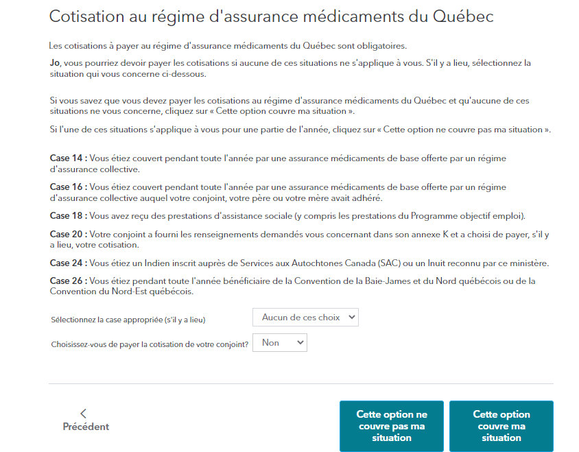Si vous savez que vous devez payer les cotisations au régime d'assurance médicaments du Québec et qu'aucune des situations expliquées dans les cases vous concerne, cliquez sur la « Cette option couvre ma situation ». Vos cotisations au RAMQ seront indiquées dans votre déclaration provinciale.