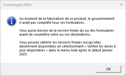 Ma question "Pouvez-vous me dire quand la version de TurboImpôt Premier 2024 sera disponible pour pouvoir transmettre les déclarations avec IMPÔTNET?" Je vérifie les mises à jour et j'obtiens toujours cette mention lorsque je fais une sauvegarde de déclarations. Est-ce ma question semble si stupide pour être la seule sans réponse?