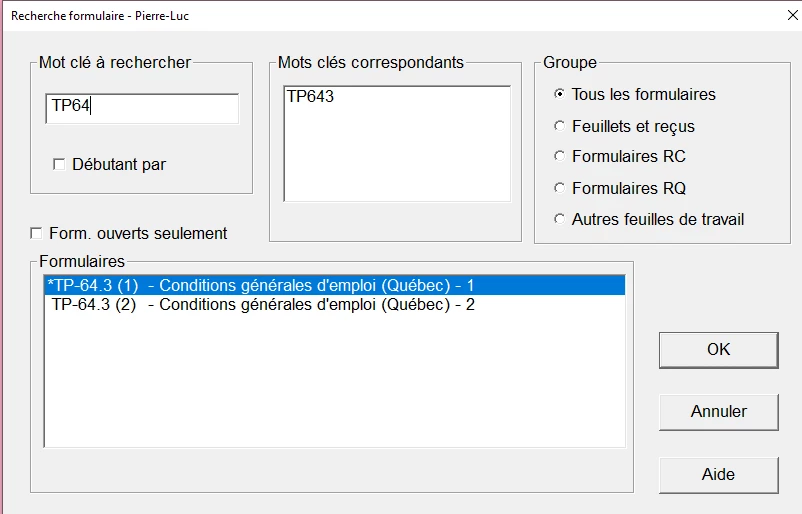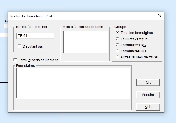 - tapez TP64 dans le champs de recherche --> cliquez sur TP-64.3 (1) dans la liste des formulaires --> cliquez le bouton OK