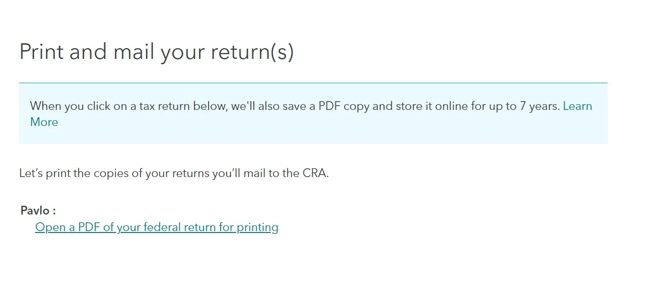 A duplicate copy is also generated on TurboTax website. I think it would be more appropriate to mail to CRA a duplicate copy (as it contains more information), but on every page of the duplicate copy it say "do not send by mail".